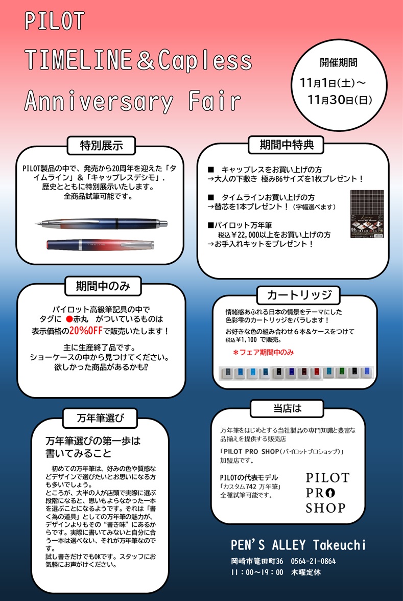 パイロットの万年筆「キャップレスデシモ」&ボールペン「タイムライン」が発売から20周年を迎えました。それを記念して、特典満載のフェアを開催します。いつもご愛用の方も、これらの商品を知らない方も歴史を含めて展示もいたしますので、ぜひお楽しみに。