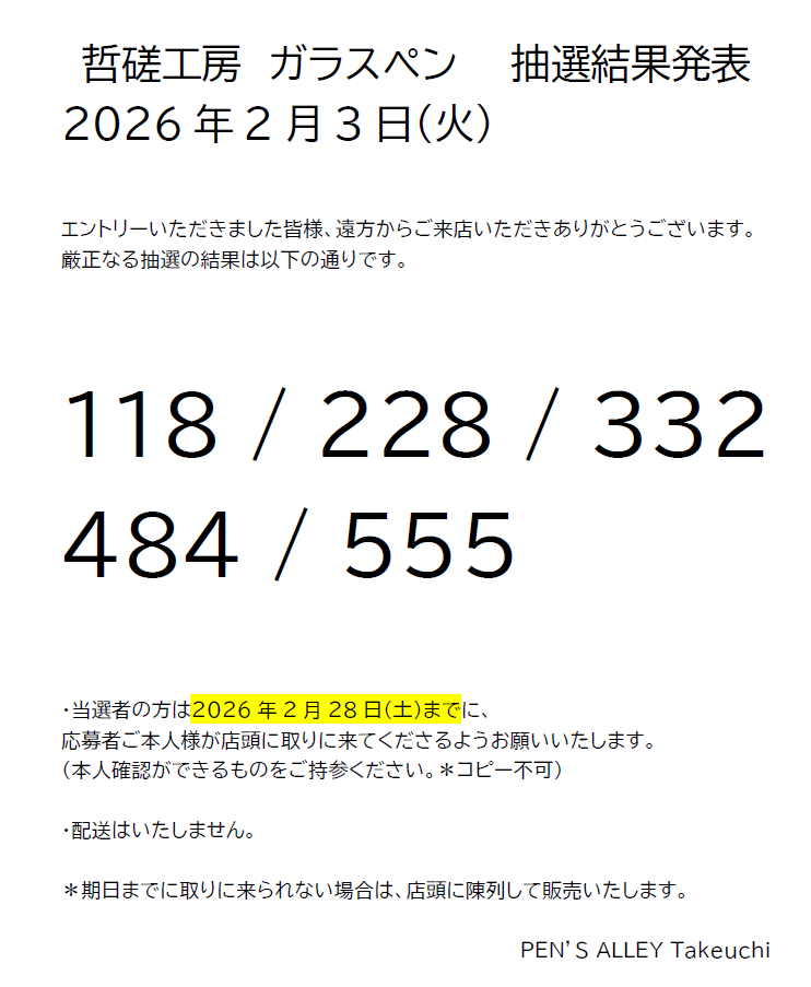 ・当選者の方は2026年2月28日(土)までに、応募者ご本人様が店頭に取りに来てくださるようお願いいたします。(本人確認ができるものをご持参ください。*コピー不可)