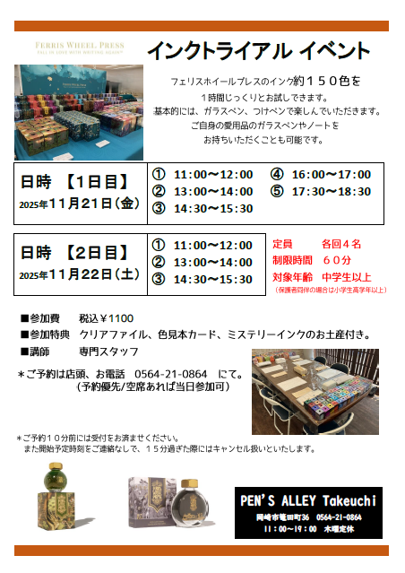 フェリスホイールプレスのインク150色を、ガラスペンつけペンで1時間じっくりとお試しいただけます。